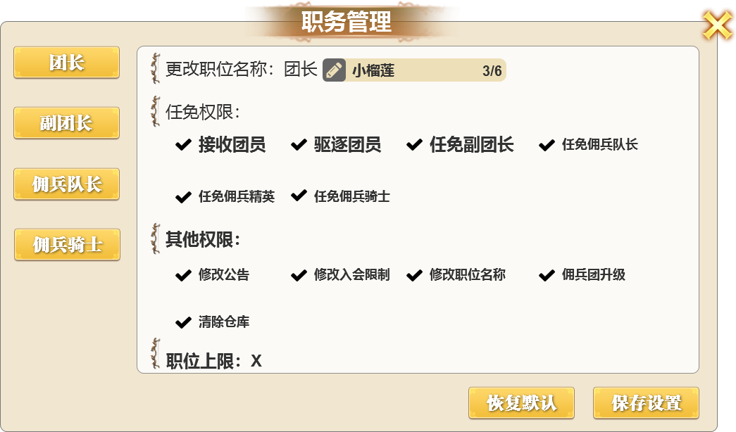 n 团长单独权限,该权限允许团长自定义职位名称,最大支持6个字且需要通过关键字检测。